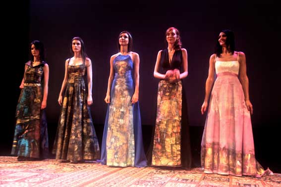 tourbillon de robes conçues sur des supports de toile, soie et organza, qui virevoltent,