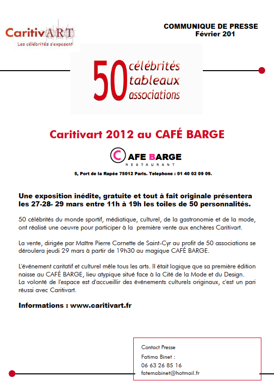 Caritivart, Fatema Binet contact Presse, Relation Publique 06 63 26 85 16 50 célébrités s'exposent les 27, 28 29 mars 2012